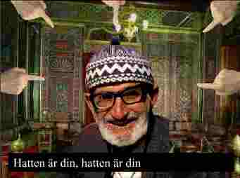 Hatten ar din を聴いたあなたは、歌が麻薬的に耳に残ることでしょう。何度もムービーを見ていますと、そのうち、おじいさんが迫ってきたり、指さされていたり、ハムが出てきたりといったことに、あなたは疑問を持ち始めます。やがて hatten = ハット = 帽子であるということに気づく頃には、あなたはもう Hatten ar din にハマっています。あなたは歌詞の意味が知りたくてたまらない!